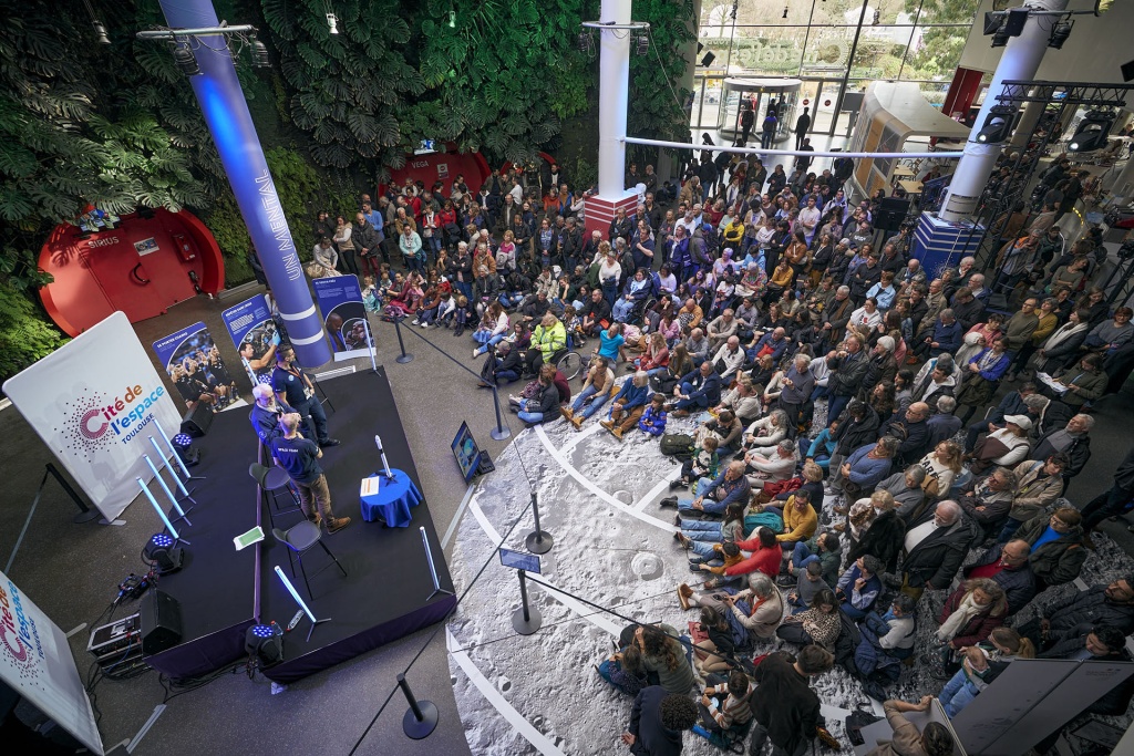 Il y a d’abord le bruit des conversations. Les enfants qui courent. Les caméras qui s’installent. Les journalistes de BFM, de l’AFP, d’Ici Occitanie qui prennent position. Les experts scientifiques du CNES, du CADMOS, du MEDES, de l’ESA, qui commentent les images. Et puis, soudain, le silence.