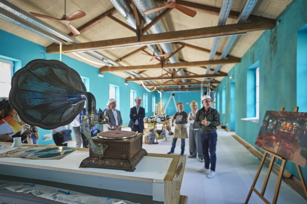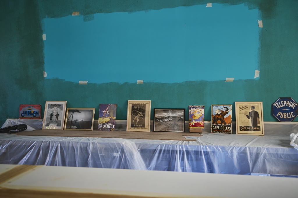 Cela fait 7 mois que Véronique Hallard, muséographe de L’Envol des Pionniers, chine tous les samedis dans les brocantes pour trouver des objets d’époque. Grâce à ce travail de fond, de nombreux objets attendent avec impatience de pouvoir être mis en place : un gramophone, une caisse enregistreuse, un poêle en fonte vert, ces cendriers publicitaires typiques ainsi que de très nombreuses plaques émaillées rappelant aussi bien les boissons de l’époque que l’épopée aéronautique. Le gramophone est pour l’occasion installé sur le comptoir en cours de patinage. Trente tours de manivelle, une pointe métallique, le bras qui se pose sur un 78 tours et la musique enfle, avec cette sonorité légèrement « éraillée » que l’on associe à la musique de cette époque. Immersion réussie !