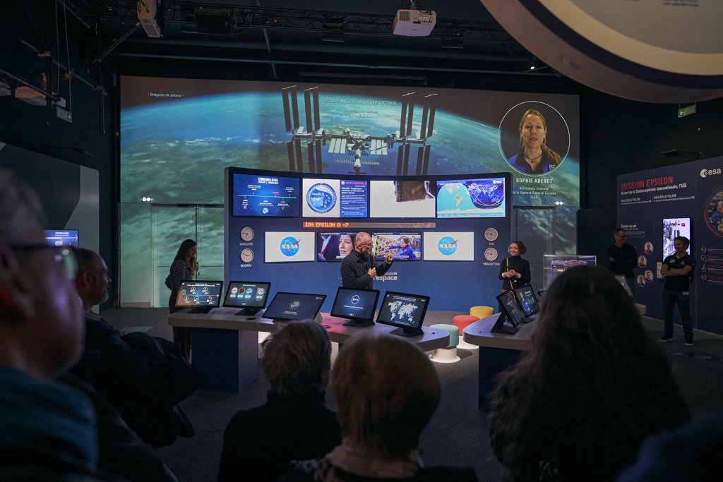 L’exposition εpsilon s’est révélée immédiatement comme un décor très prisé par les médias. Tout dans la scénographie contribue à créer un environnement visuel parfait pour les duplex et reportages. L’avantage du lieu ? Il permet d’illustrer l’actualité tout en disposant d’éléments concrets à montrer : les expériences, les écrans diffusant les images de l’ISS, la position en temps réel de la station. Un mix efficace d’informations rigoureuses et de décor immersif.